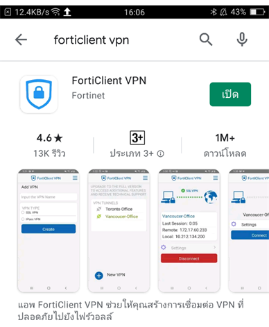 1. สามารถ Download โปรแกรมได้โดยตรงจาก Google Play โดยค้นหาคำว่า “FortiCleint VPN”