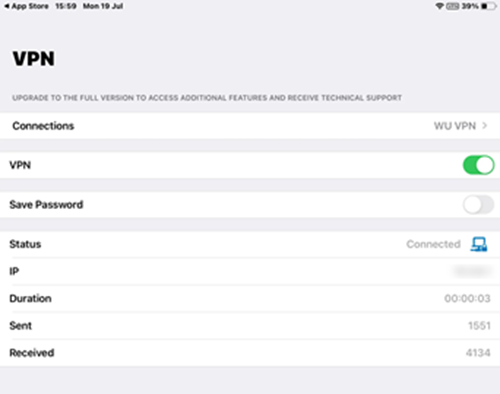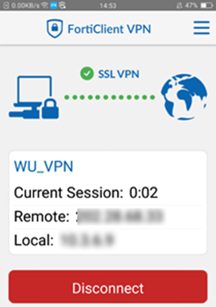 8. หาก Login ผ่าน Application จะทำการเชื่อมต่อ VPN โดยระบุหมายเลข IP Address เพื่อเป็นการยืนยันว่าเชื่อมต่อ VPN สำเร็จแล้ว ดังรูปตัวอย่าง